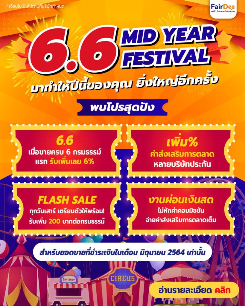 ผ่านไปไม่นาน ก็ครึ่งปีแล้ว เป็นอย่างไรกันบ้างครับ เนื่องด้วยสถานการณ์โควิด-19 ทำให้เศรษฐกิจชะลอตัวลงเป็นอย่างมาก หลายกิจการปิดตัวลง แฟร์ดีเล็งเห็นถึงปัญหาและเข้าใจปัญหาที่ตัวแทนทุกท่านพบเจอ จึงจัดโปรโมชันดี ๆ ในเดือนมิถุนายน ให้กับตัวแทนทุกท่าน ให้กลางปีนี้มีความสุขมากยิ่งขึ้น เราจัดมาให้ถึง 4 โปรโมชันด้วยกัน