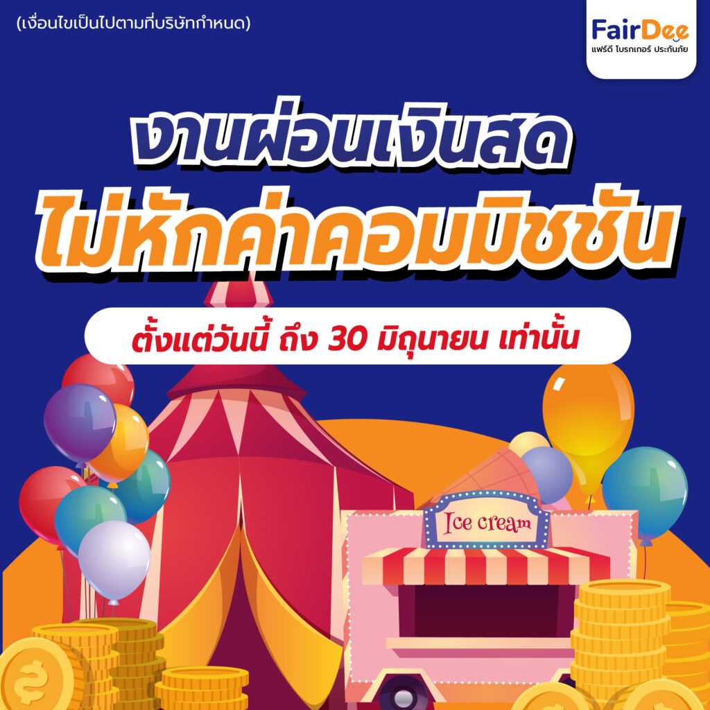 งานผ่อนเงินสดฟรีค่าธรรมเนียมทุกกรมธรรม์ไม่จำกัดเมื่อชำระงวดแรกในเดือนมิถุนายน เมื่อชำระเงินครบตามงวด จะได้รับค่าส่งเสริมการตลาดเต็มจำนวน โดยไม่มีการหักค่าคอมมิชชัน